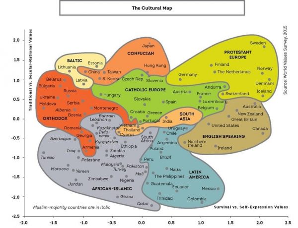 In the cultural map in the figure, the horizontal axis constitutes the scale between survival and the freedom of self-expression, while the comparison of traditional values with the secular understanding is made on the vertical axis. When we look at the position of Sweden, it will not be a coincidence that it is in the upper right corner.